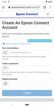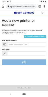 Epson Connect’te yeniyseniz ve aşağıdaki ekran geldiyse Yeni hesapla etkinleştir’a Epson Connect Hesabı Oluştur ekranına gitmek için tıklayın.