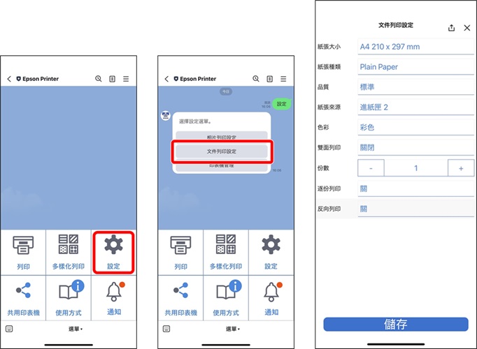 請從選單揀『設定』,然後點開聊天室畫面出現的『文件列印設定』。